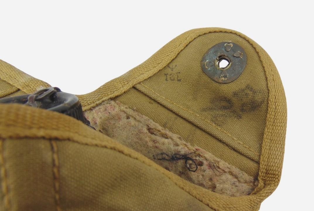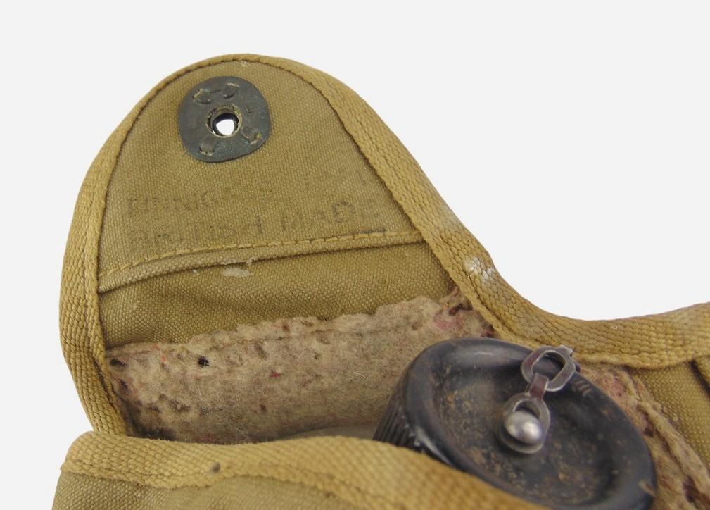 Gourde US complète de fabrication British Made. Housse en bonne condition les pressions LIFT THE DOT sont fonctionnel, couleur bien fraîche avec un beau marquage sur la face avant, marquage fabricant à l'intérieur d'un des rabats.