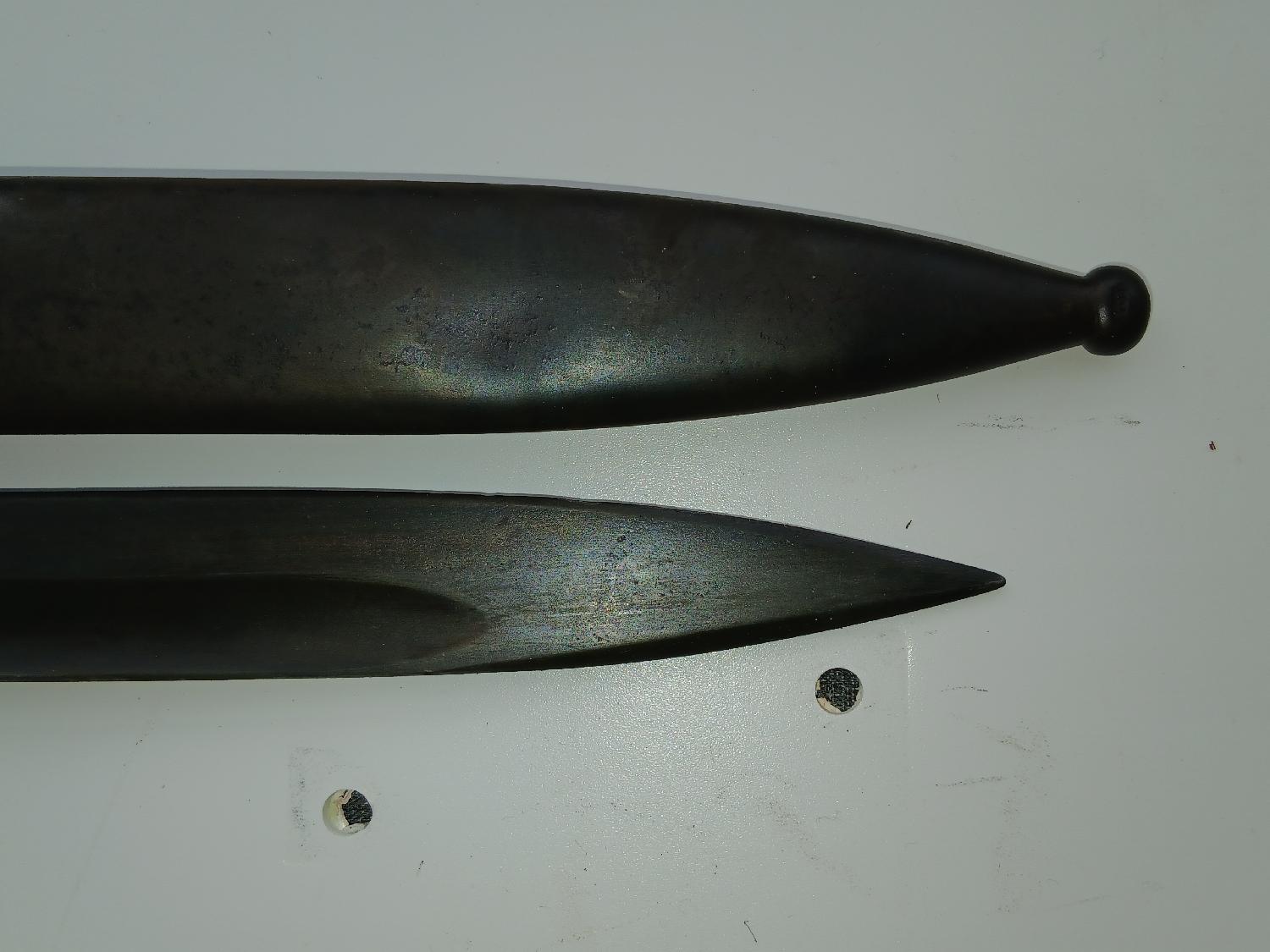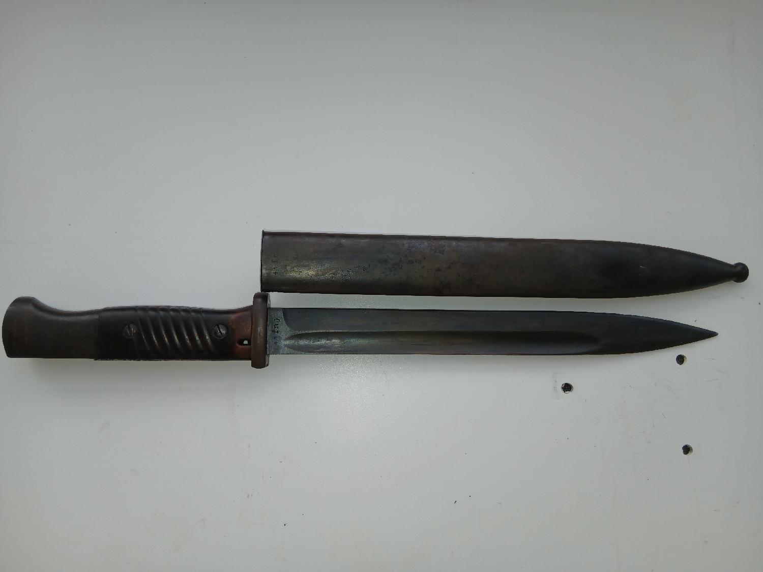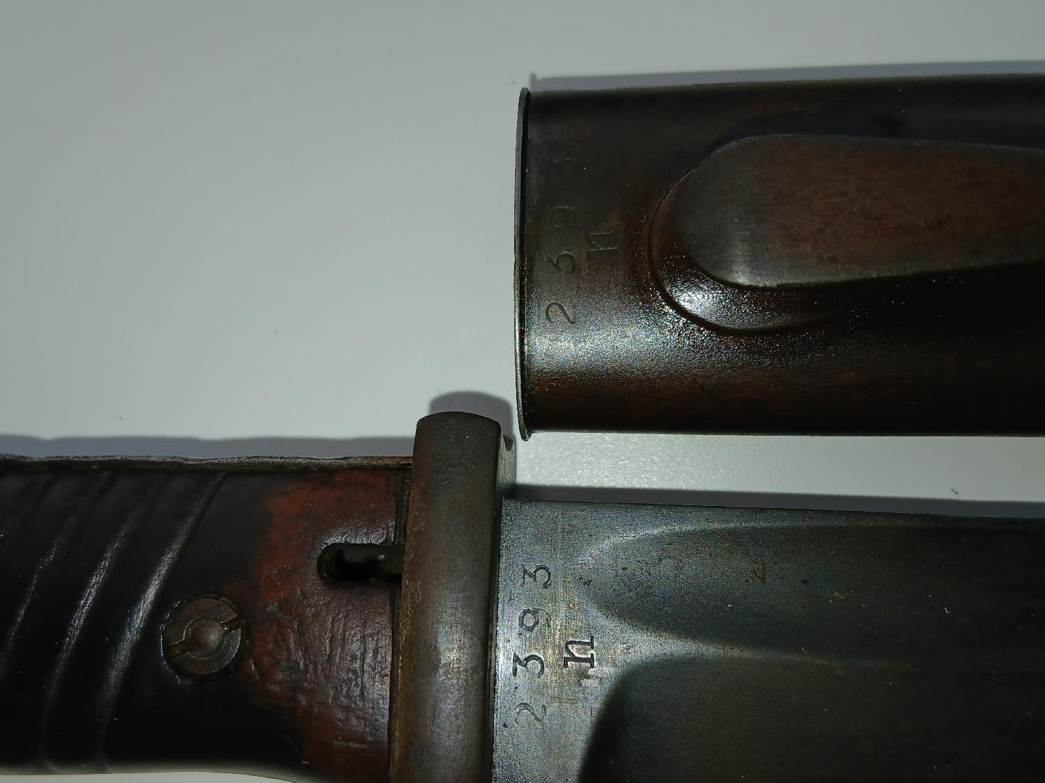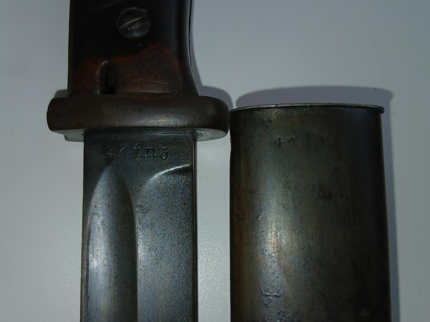 Baionnette fnj41 aux N°. Quelques petits coups sur le dos de la lame. Manque vis d'étuis.