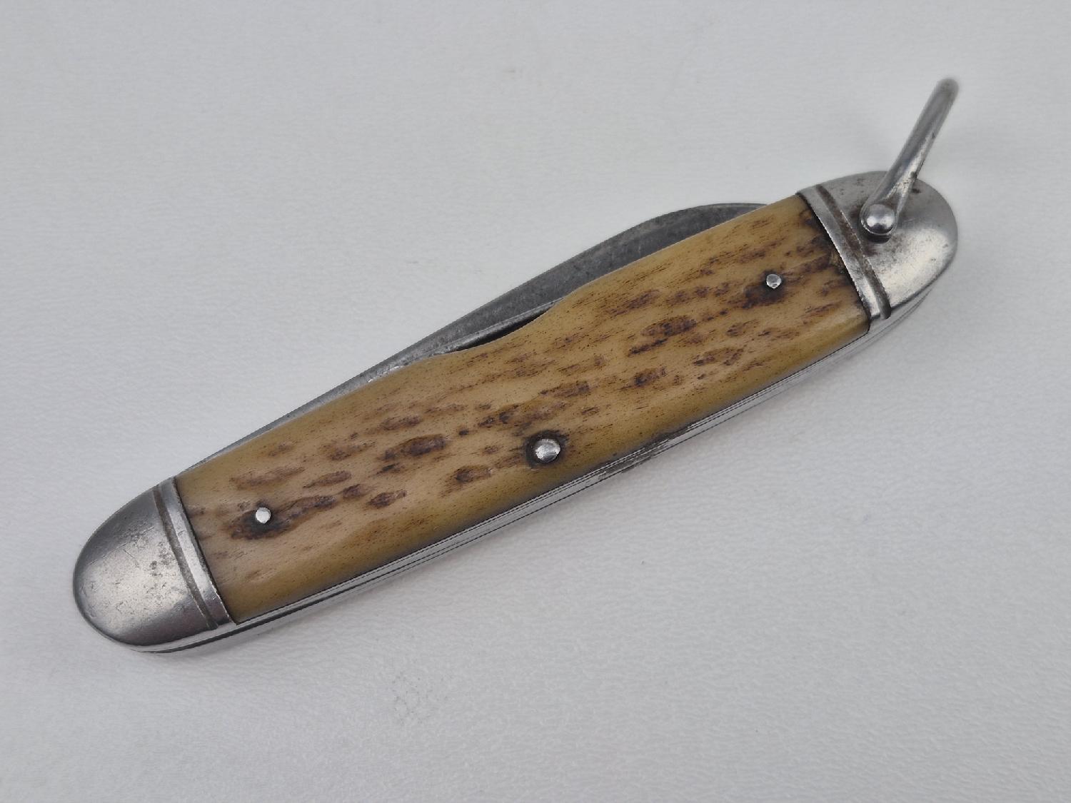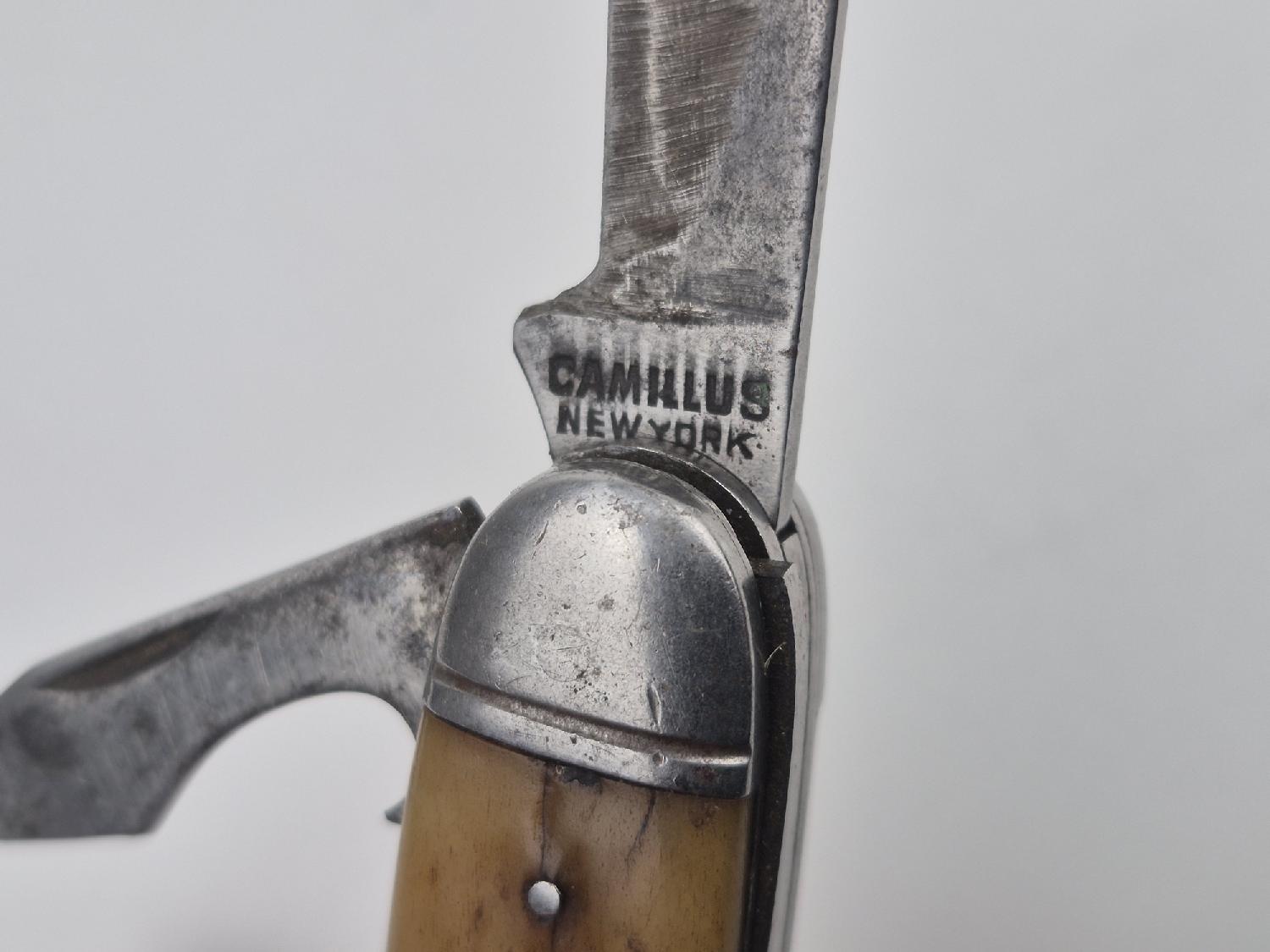 Réalisé avec manche en corne, le couteau est de fabrication Camillus, fabricant connu pour la fabrication d'armes blanches.