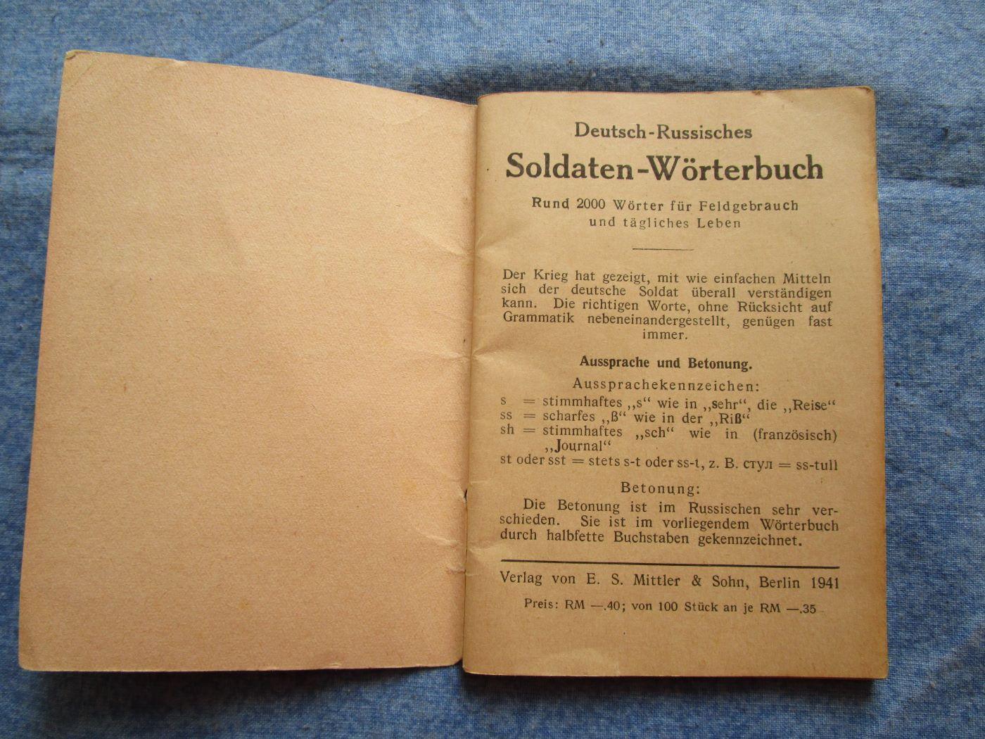 Soldaten-Wörterbuch, daté 1941. Format 12x8 cm, 71 pages. Une petite déchirure de 3 cm sur la tranche. Prévoir 3.10 euros en lettre verte ou 3.70 euros en lettre verte suivie.
