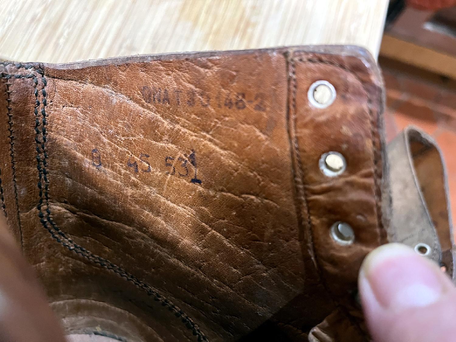 Bonjour, AV une belle paire de brodequins M1945 jamais portés. A priori datés 1945, longueur semelle 29 cm. Cuir à assouplir. Port en supplément SVP (+ de 1,5 kg). Remise en main propre possible (75020). Paypal entre proches ou virement bancaire.