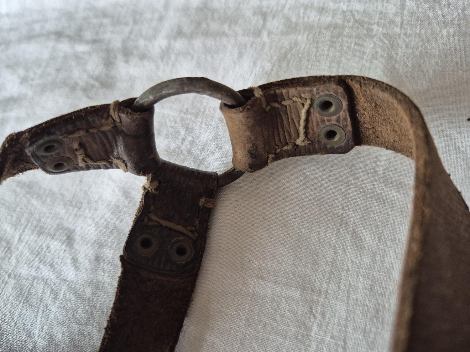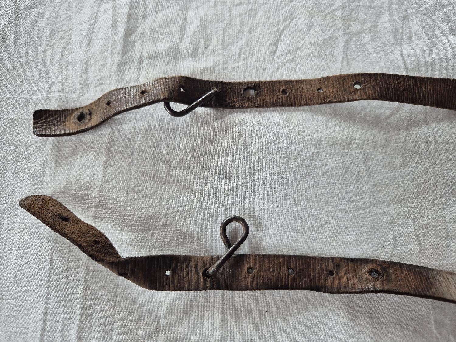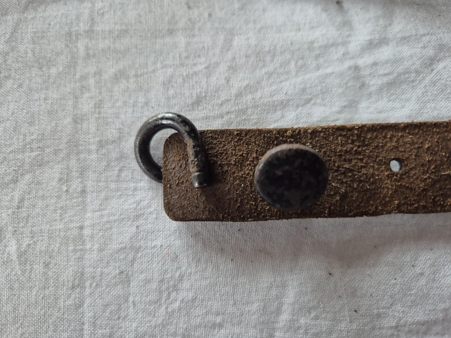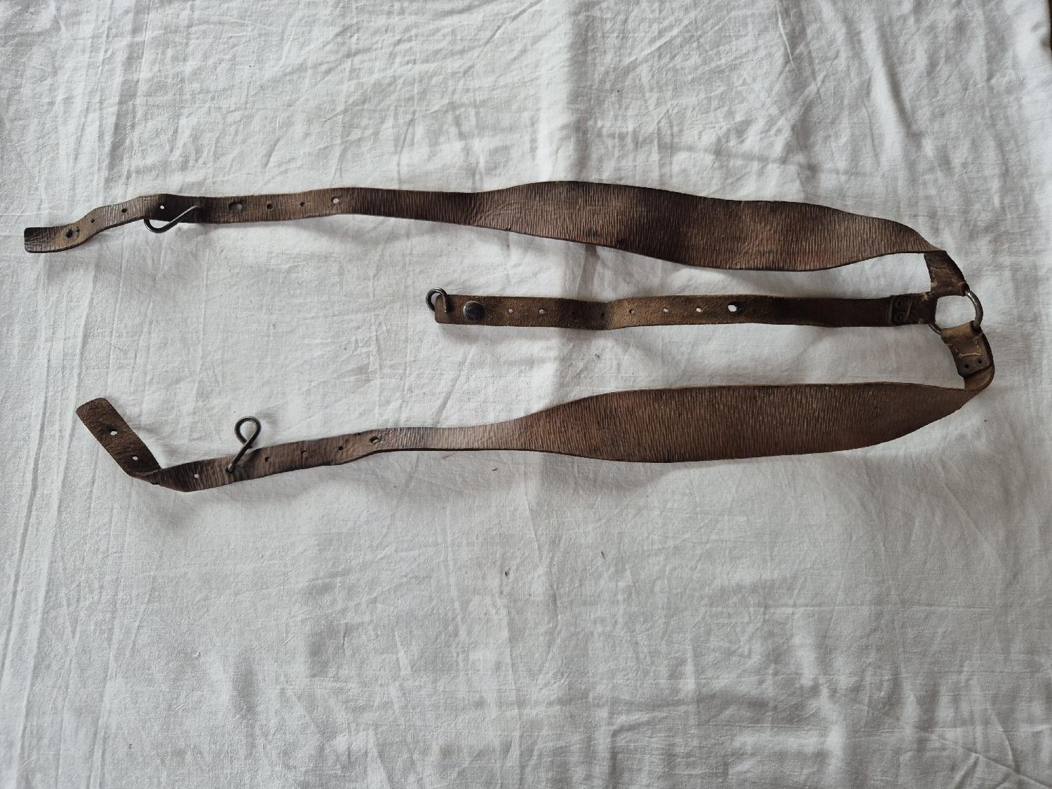 Dans son état de découverte, un brellage en cuir souple, couleur chocolat. il a 09 trous et ses crochet de suspente. Prix en port compris, envoi en mondial relai. Règlement par chèque, ou virement. PAS DE PAYPAL.