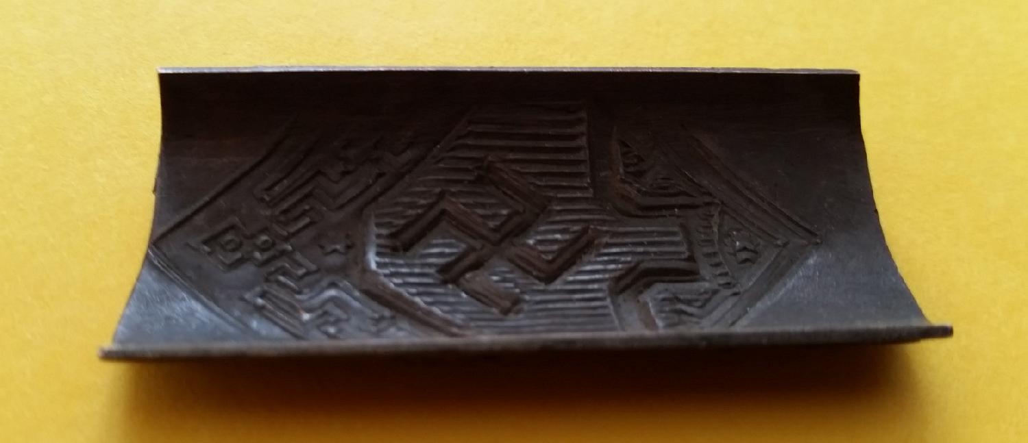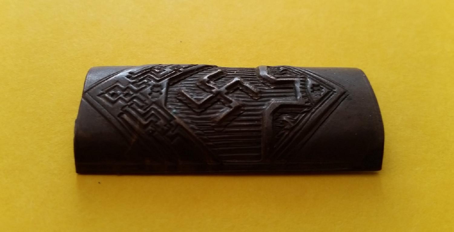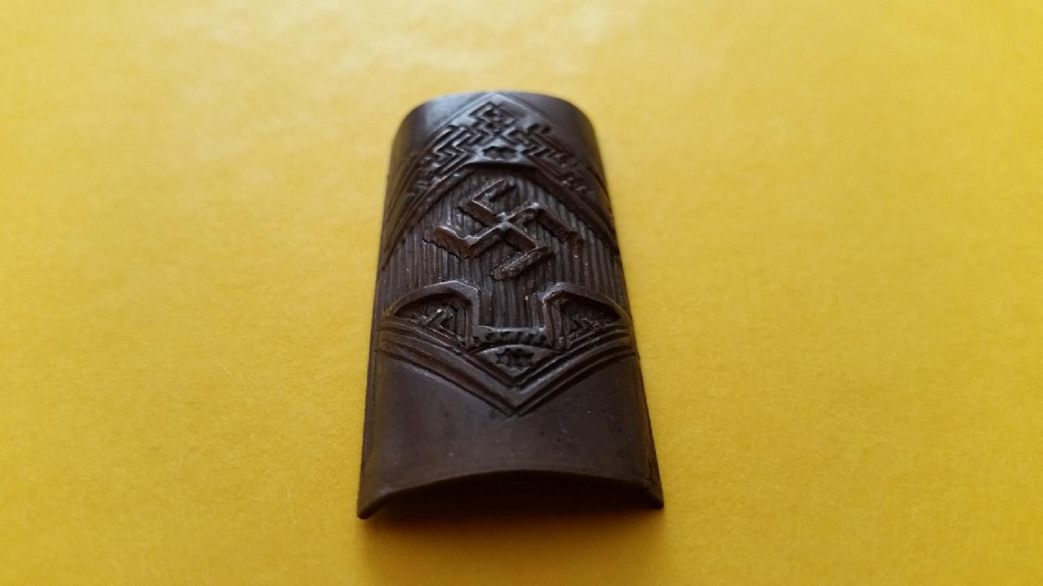 Insigne en bronze représentant une Swastika avec des décorations stylisées. Forme convexe, avec une hauteur de 4,6 cm et une largeur de 2,1 cm. Très bon état. Rare. Authentique, respect de la charte du collectionneur.