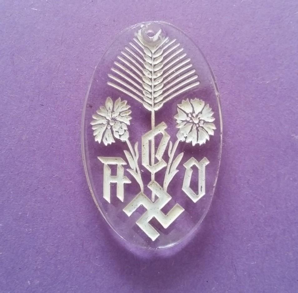 Médaillon en cristal du VDA IIIème Reich ou Volksbund für Deutschtum im Ausland (Fédération du peuple pour les Allemands de l’étranger »). Hauteur de 3,5 cm avec éléments gravés. Authentique, respect de la charte du collectionneur.