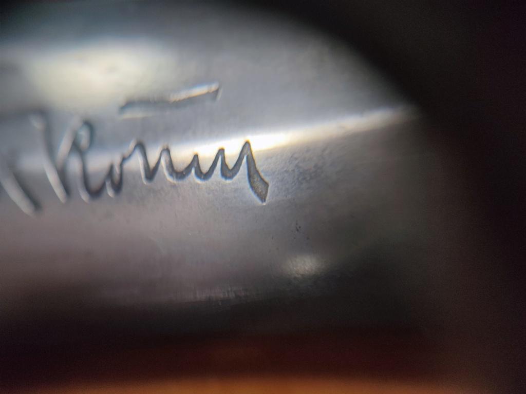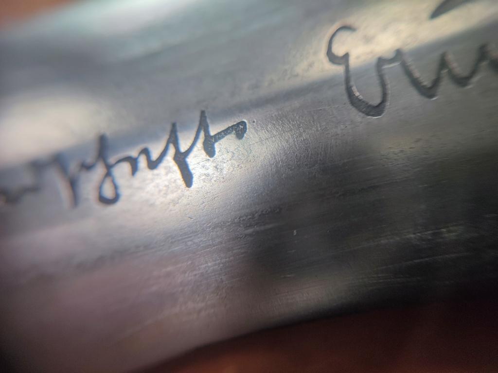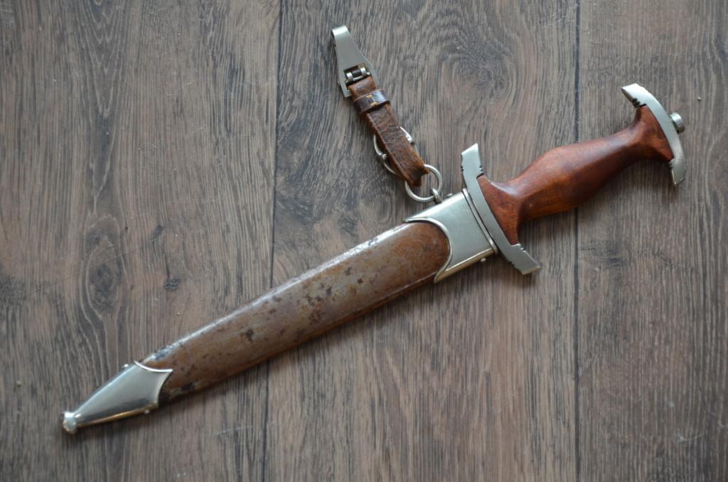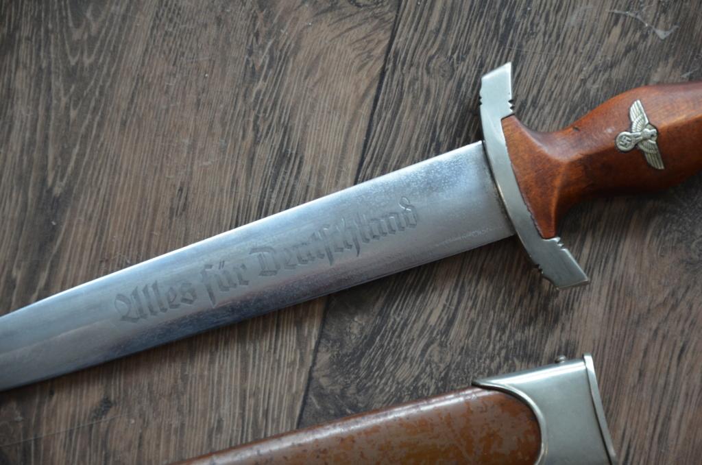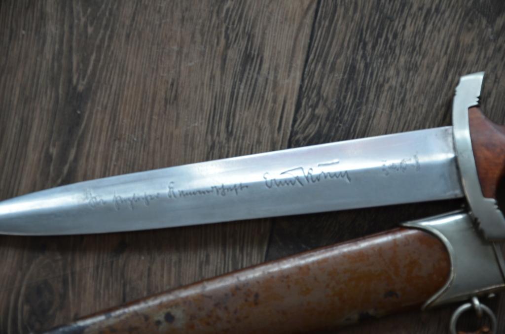 Je place à la vente pour mon oncle qui n'est pas sur le forum, cette dague SA de E.P.&S. avec dédicace Ernst Röhm. Garde frappée "SW", manque de peinture et quelques traces d'oxydation sur le fourreau, en regardant a la loupe, le fond de gravure de la dédicace n'est pas lisse. La lame semble avoir été "nettoyée" (infimes traces d'oxydation).