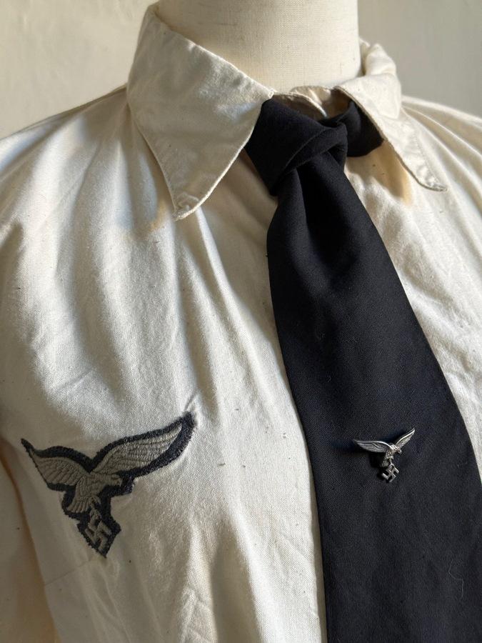 Une Chemise Blanche avec aigle de poitrine de la Luftwaffe cousu à la machine d’origine, insignes des transmissions à l’épaule cousu à la machine d’origine, marquage fabricant au col daté de 1942