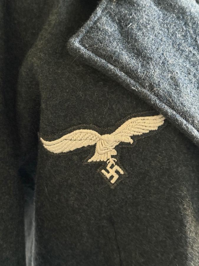 Veste en laine 2 poches, aigle de poitrine de la Luftwaffe monté d’origine à la machine, insigne des transmissions monté d’origine à l’épaule, 1 bride de décoration, doublure intérieure avec marquage daté de 1944