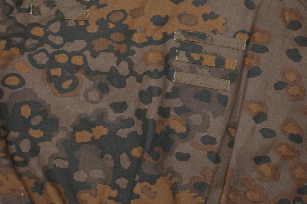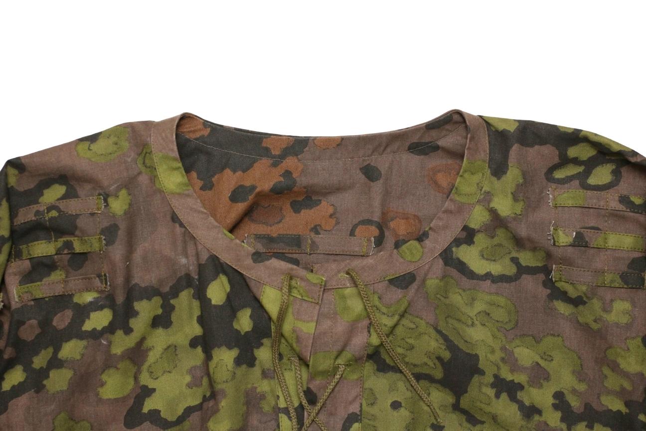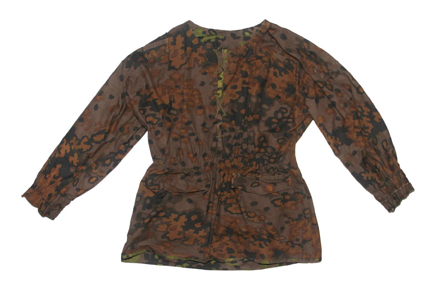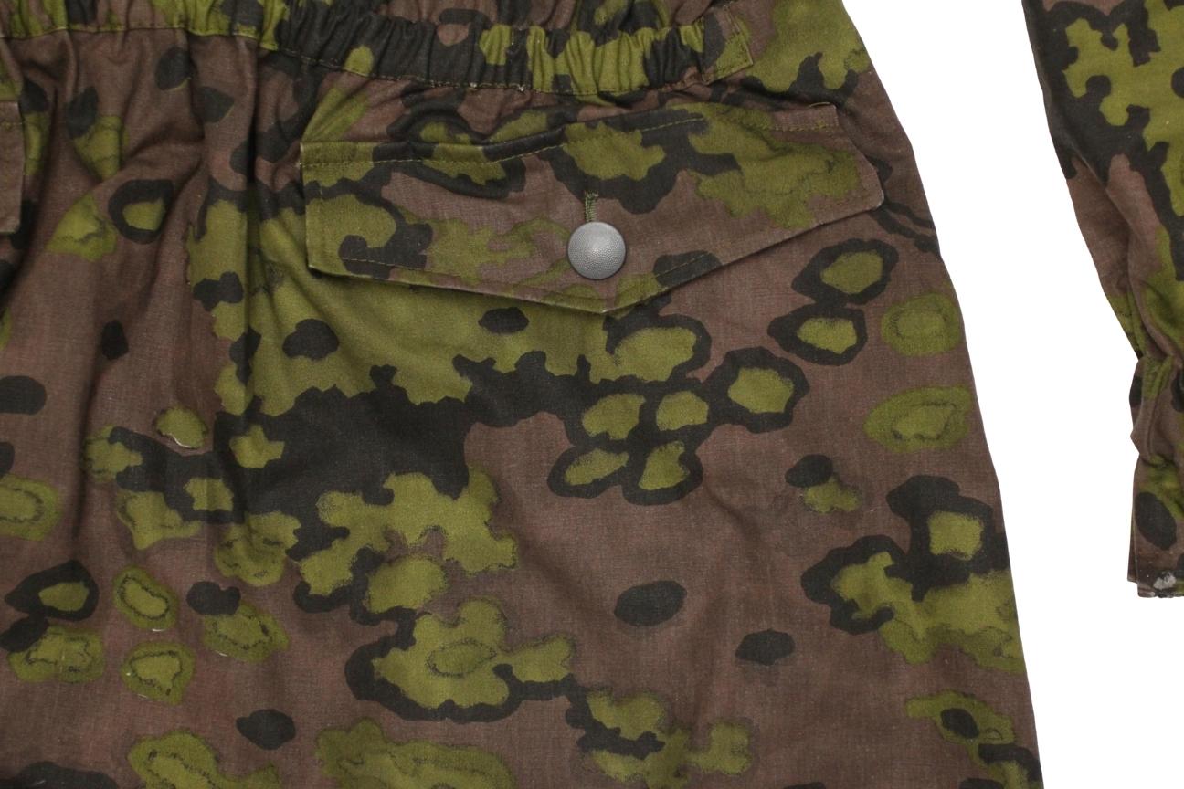 Reproduction d’une blouse camouflée M42 fabriquée au début des années 2000. La veste est en très bon état général et elle n’a jamais été portée. Elle présente comme des traces d’usure au bas des manches. La blouse est réversible. Elle possède deux poches à l’avant qui ferment par des boutons grenelés cousus. Les boutons sur la face automne ont été cousus au mauvais endroit et sont à replacer. Les boutons sont des pièces originales fabriquées par la firme PuC à Lüdenscheid. Ils sont en aluminium et datés 38. Cette veste convient pour la reconstitution historique ou la collection.