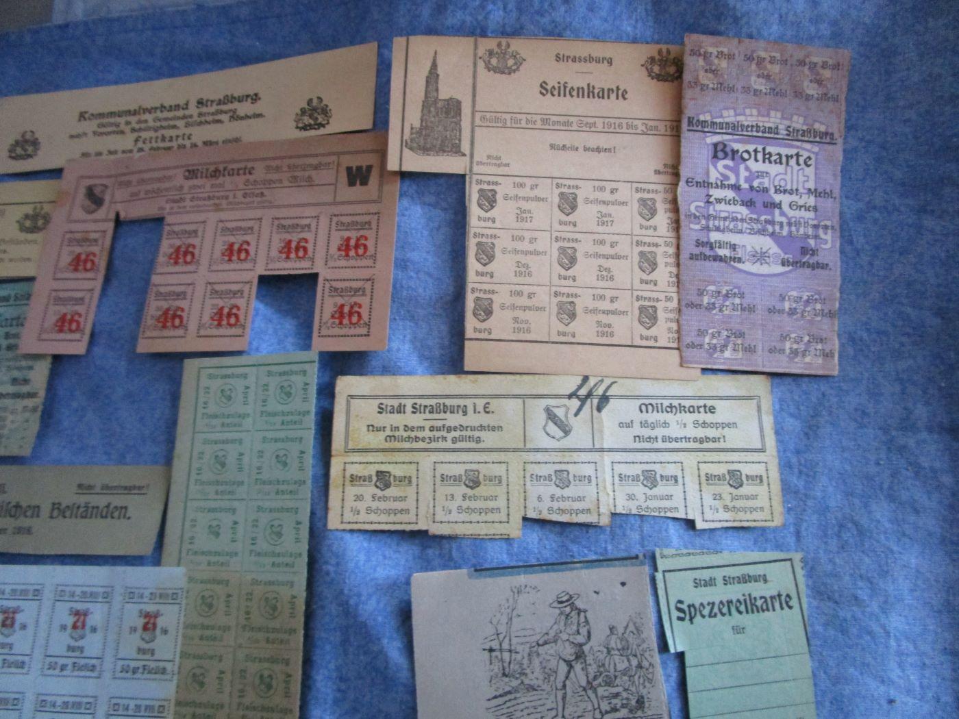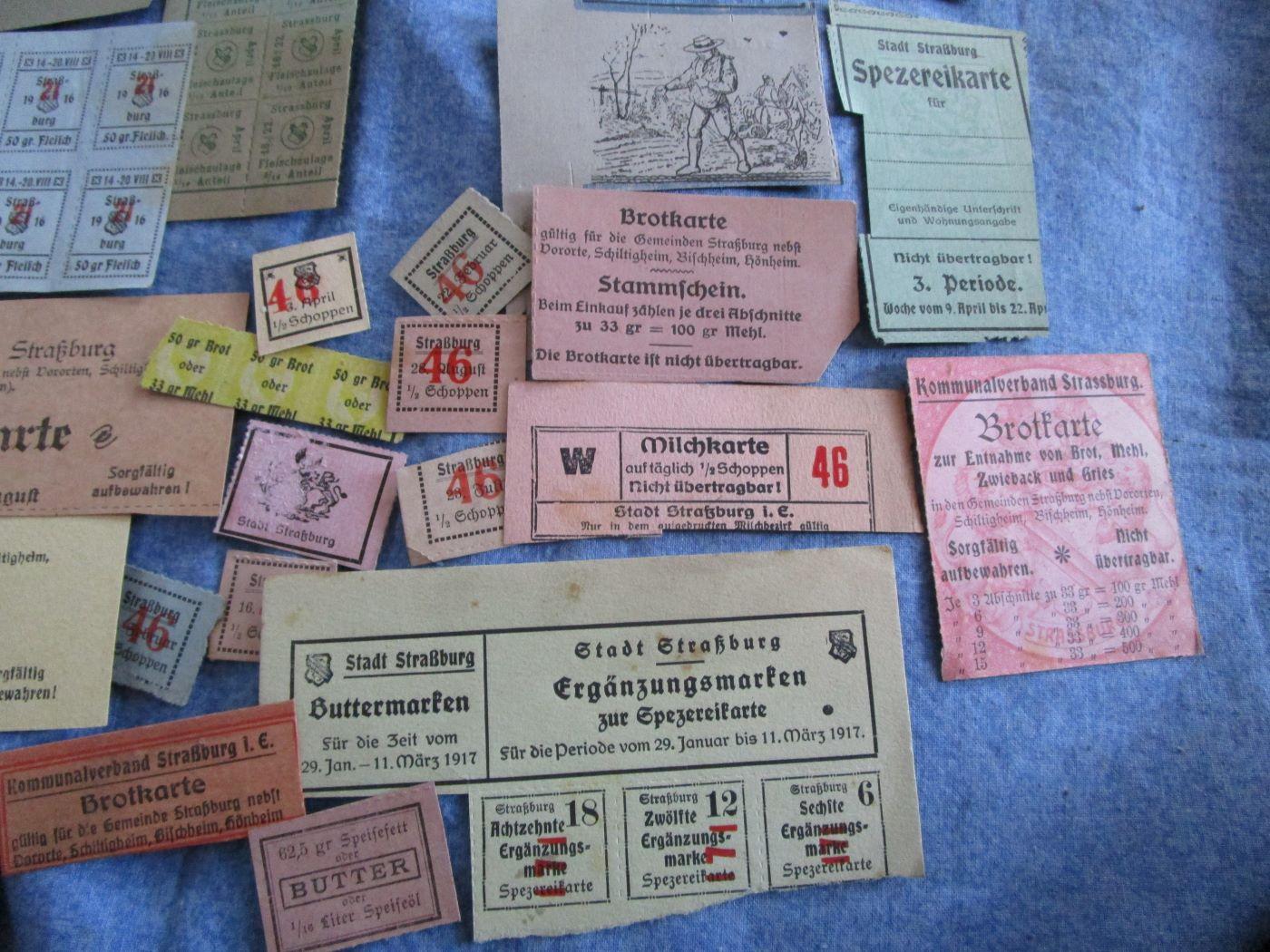 Tickets de rationnement de la ville de Strasbourg, certains datés 16/17. Prix pour le tout. Prévoir 3.10 euros en lettre verte ou 3.70 euros en lettre verte suivie.