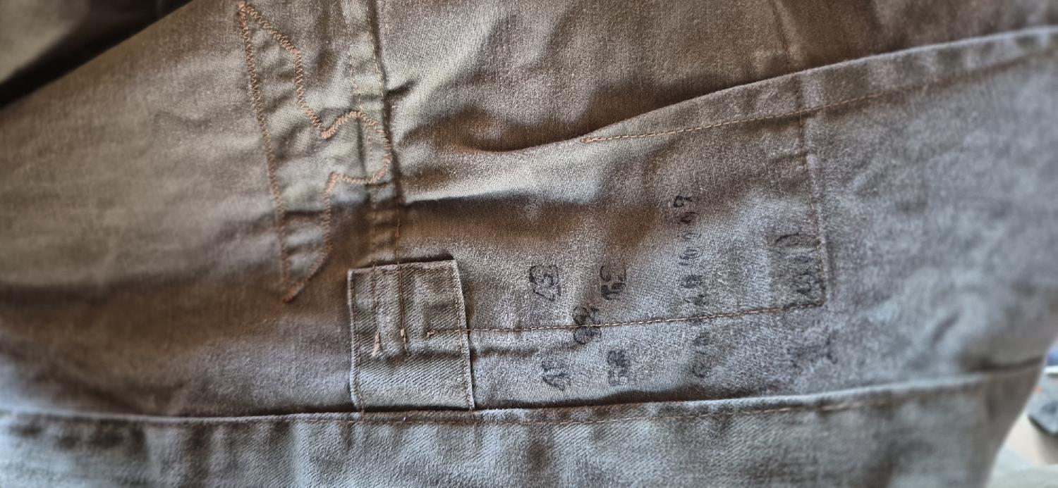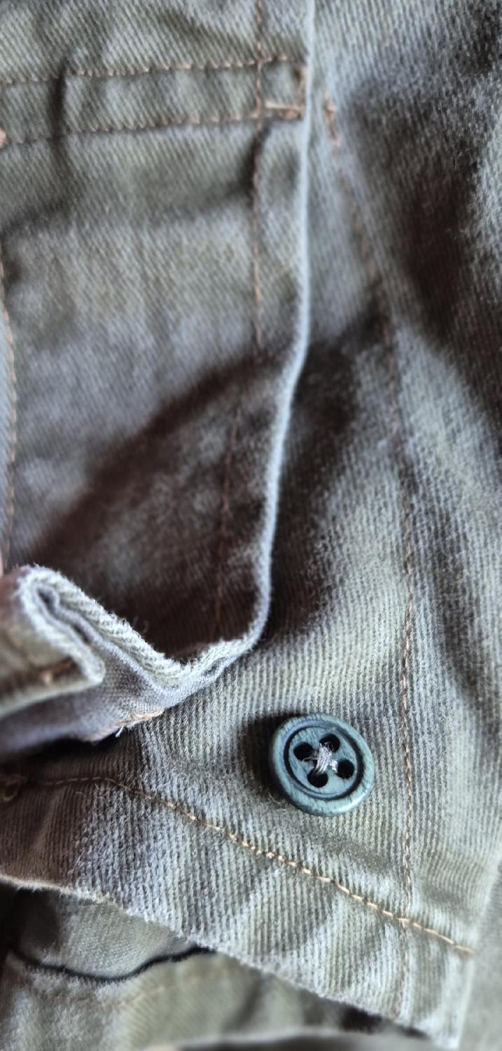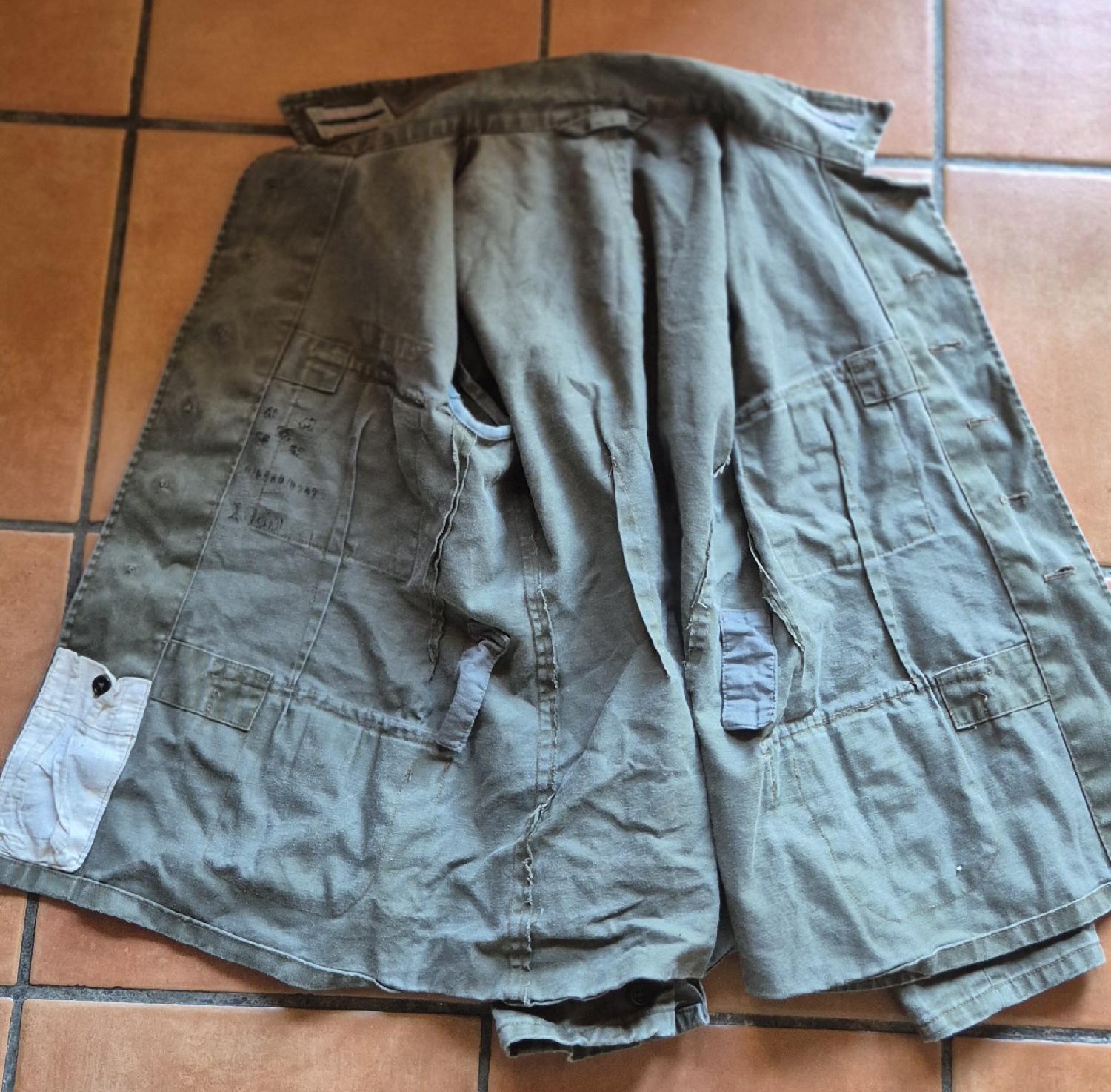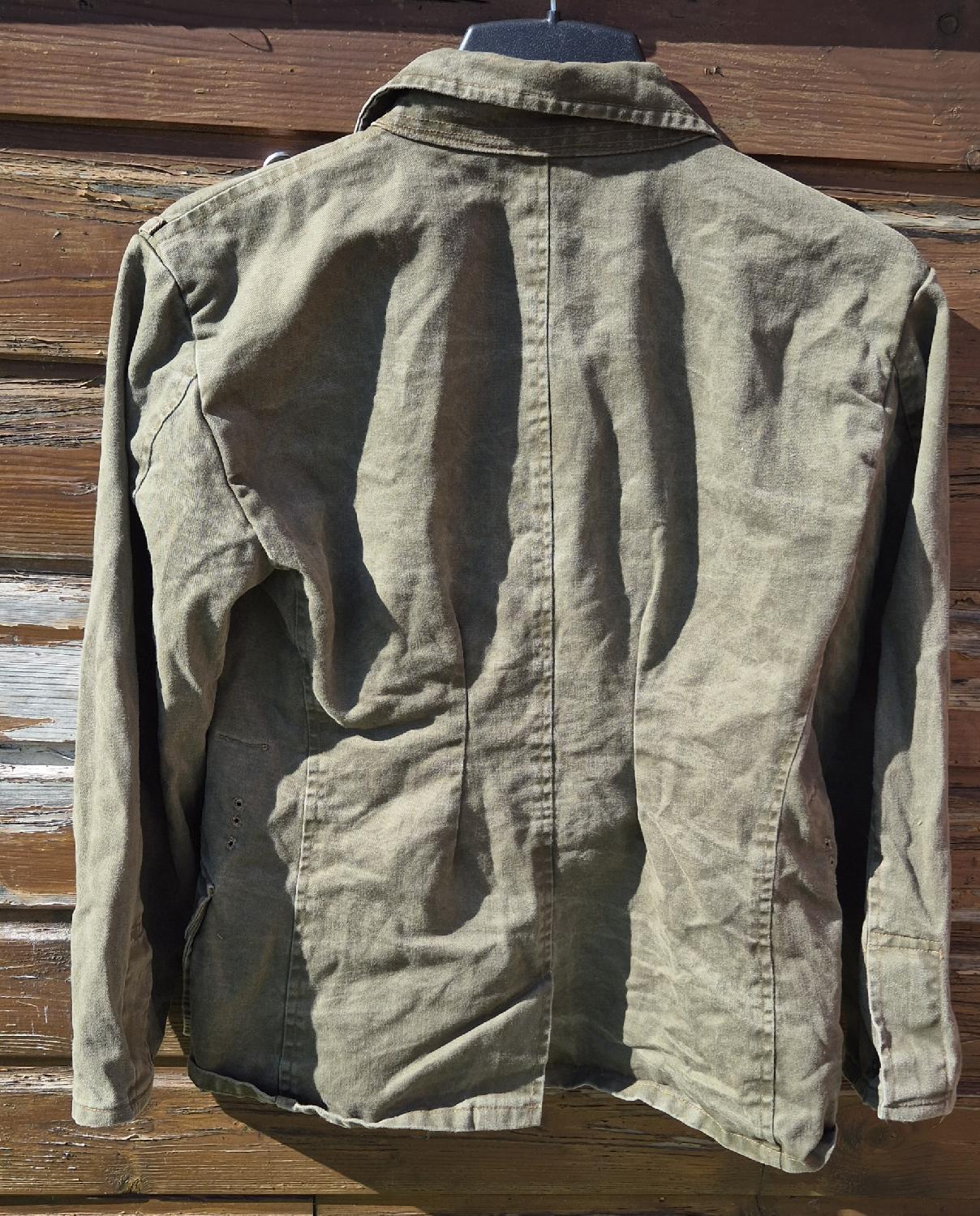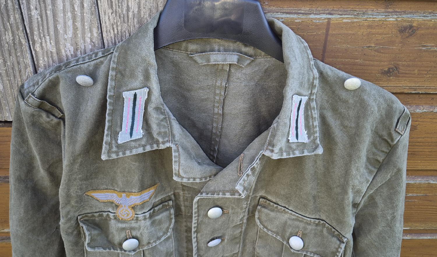 Tous les boutons présents. Col zigzag. Pas de trous. Légère patine. Insignes cousus d'origine. Taille 96 cm.