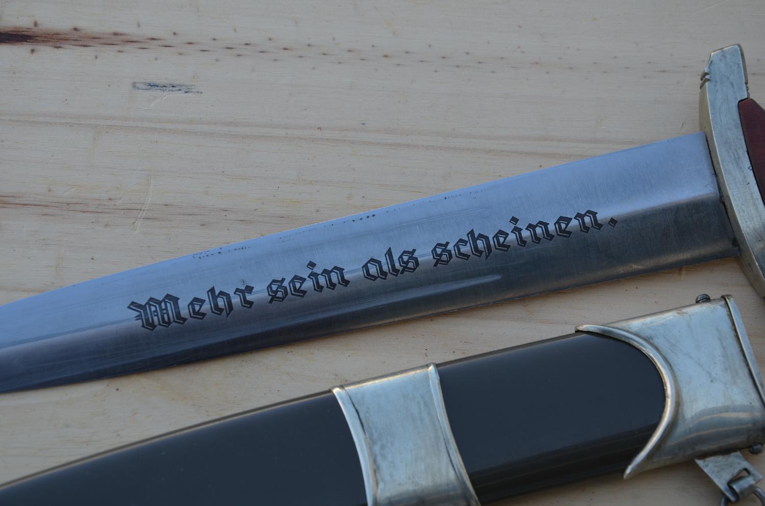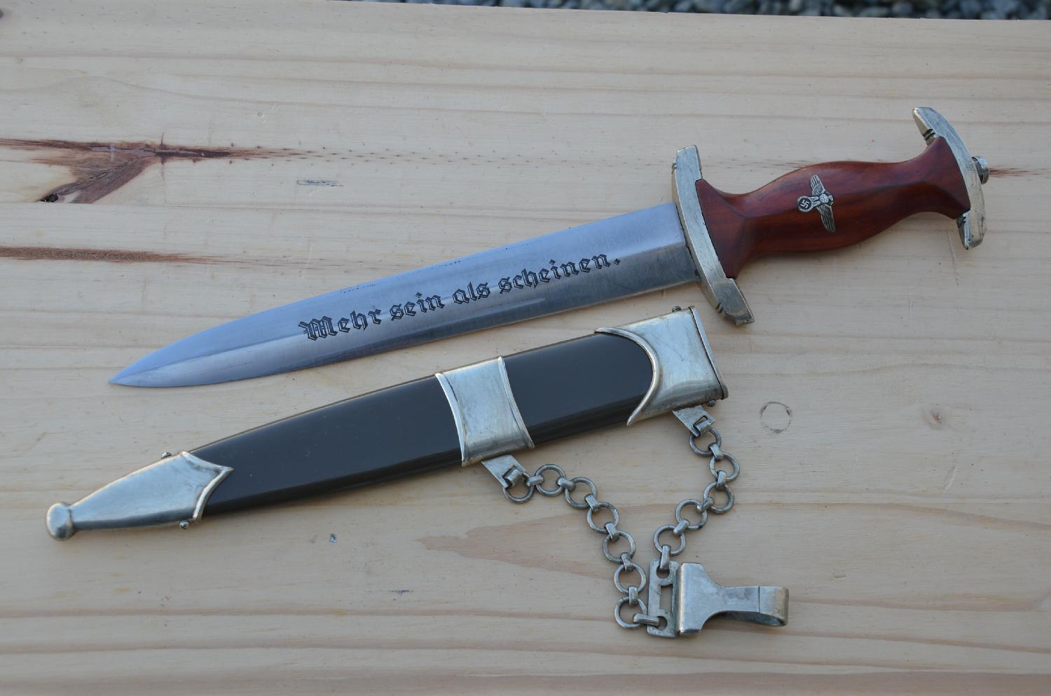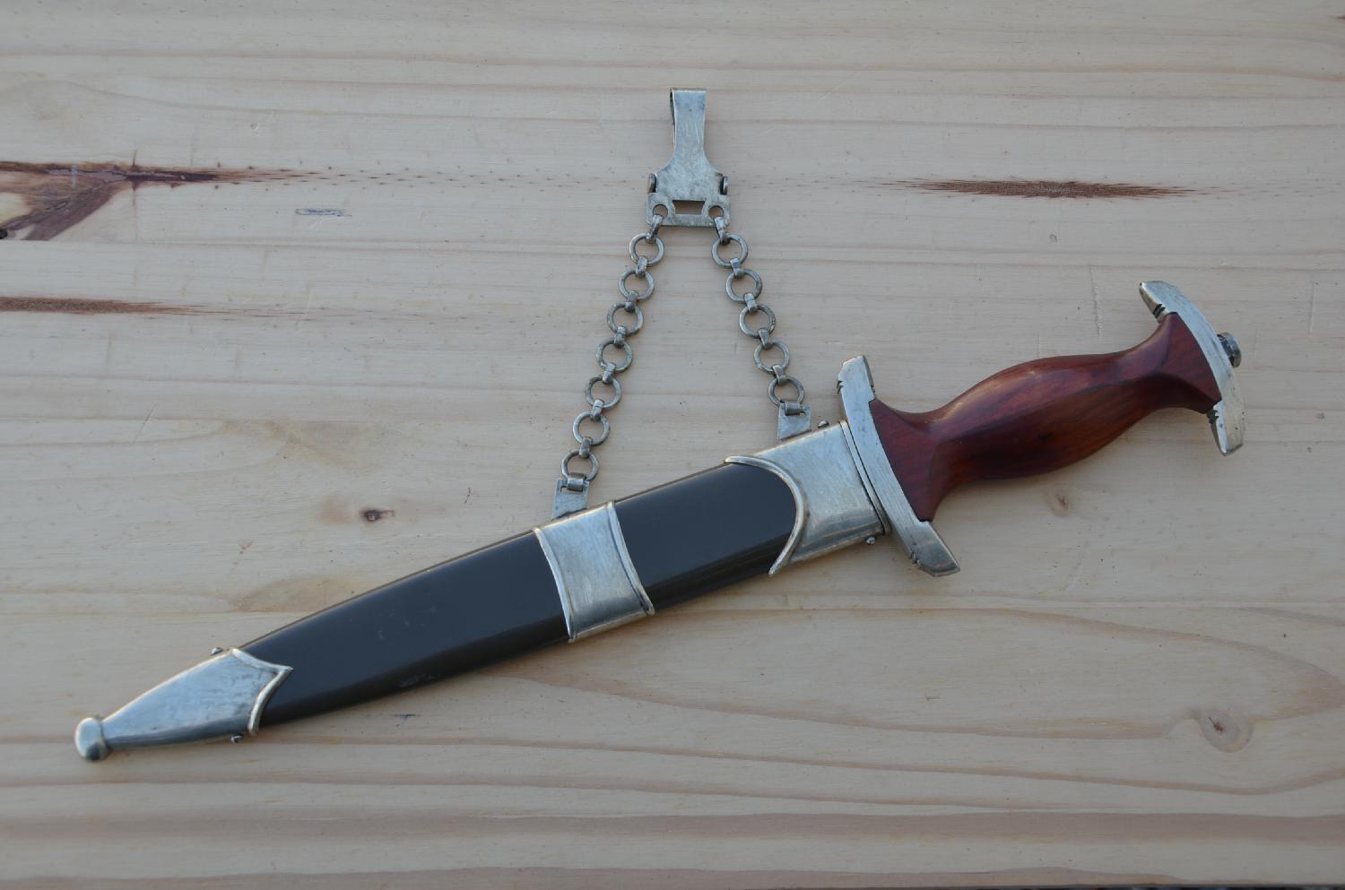 Je place à la vente pour mon oncle cette magnifique dague à chaine Napola, de cadre instructeur. Lame en parfait état, fourreau vert.