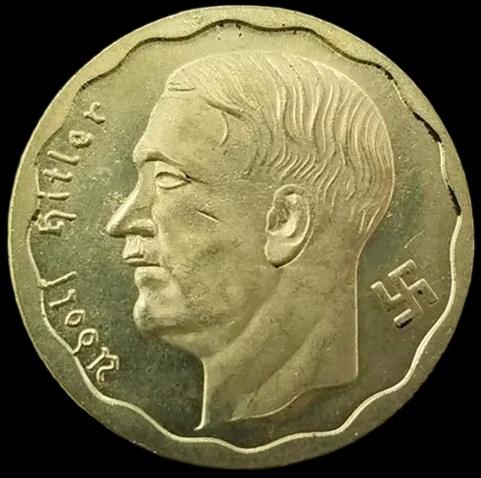 Cette reproduction a été réalisée à partir d'une pièce authentique, sortant d'un lot qui a été frappé vers 1955 en Argentine, où certains déserteurs nationaux-socialistes se sont réinstallés après la défaite de l’Allemagne. Les pièces originales sont en or 18 carats.