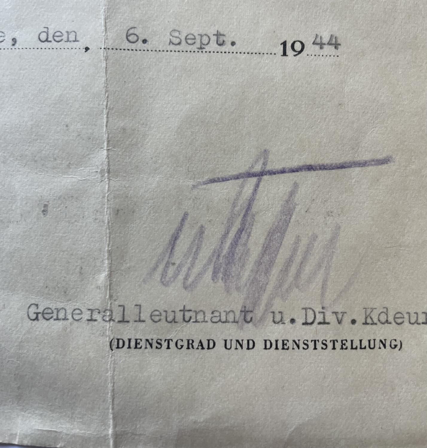 Beau document de la 20 Pz division qui n’est pas si commun. Front de l’est. Signé par General der Panzertruppe Mortimer von Kessel (KC 28.12.1943, OL 16.10.1944