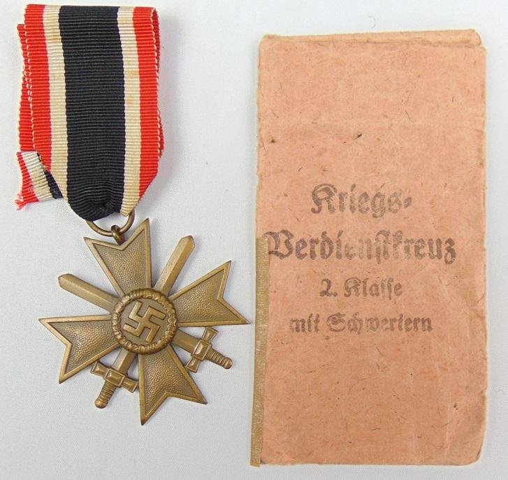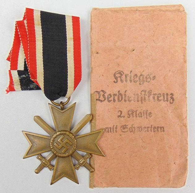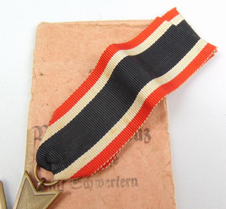 Croix du mérite de guerre avec glaives, le ruban et pochette en papier sont présent.