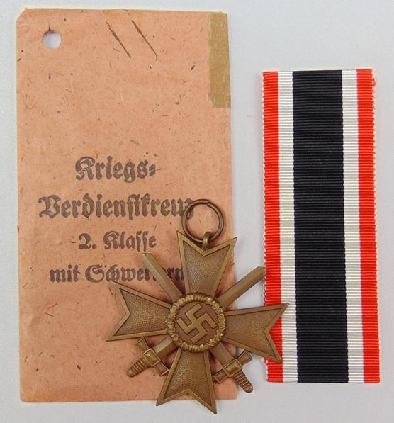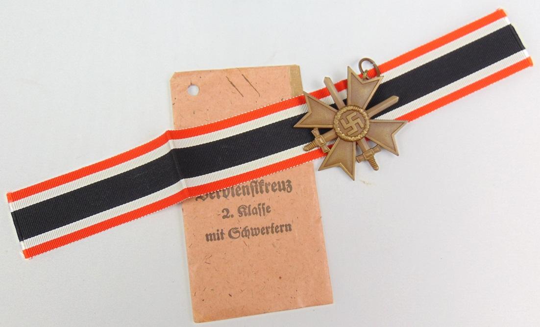 Croix du mérite de guerre avec glaives, le ruban et pochette en papier sont présent.