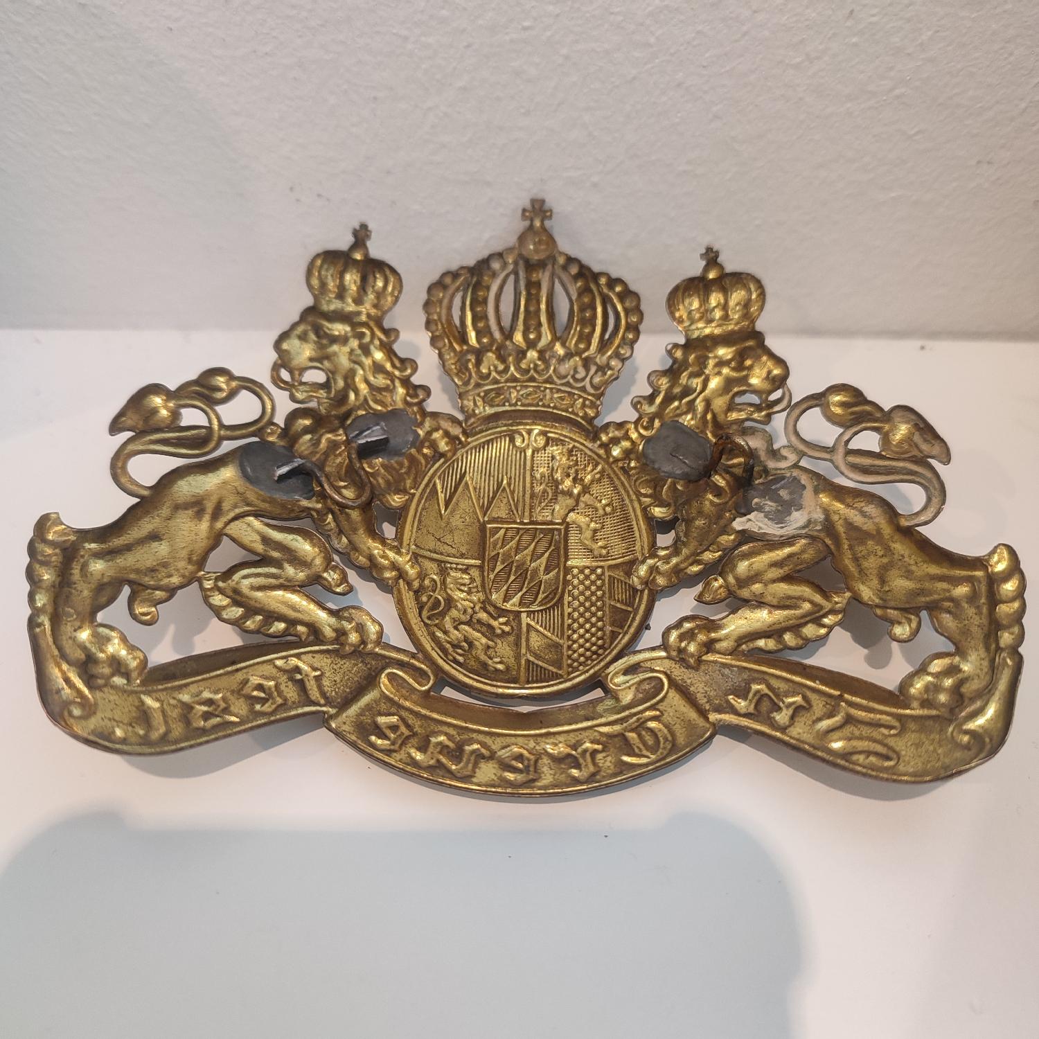 Très belle plaque de casque à pointe Bavarois 1896. Les soudures sont d'origine. Une des fixations s'est dessoudée. La queue d'un lion s'est légèrement détachée.Petit prix en conséquence.