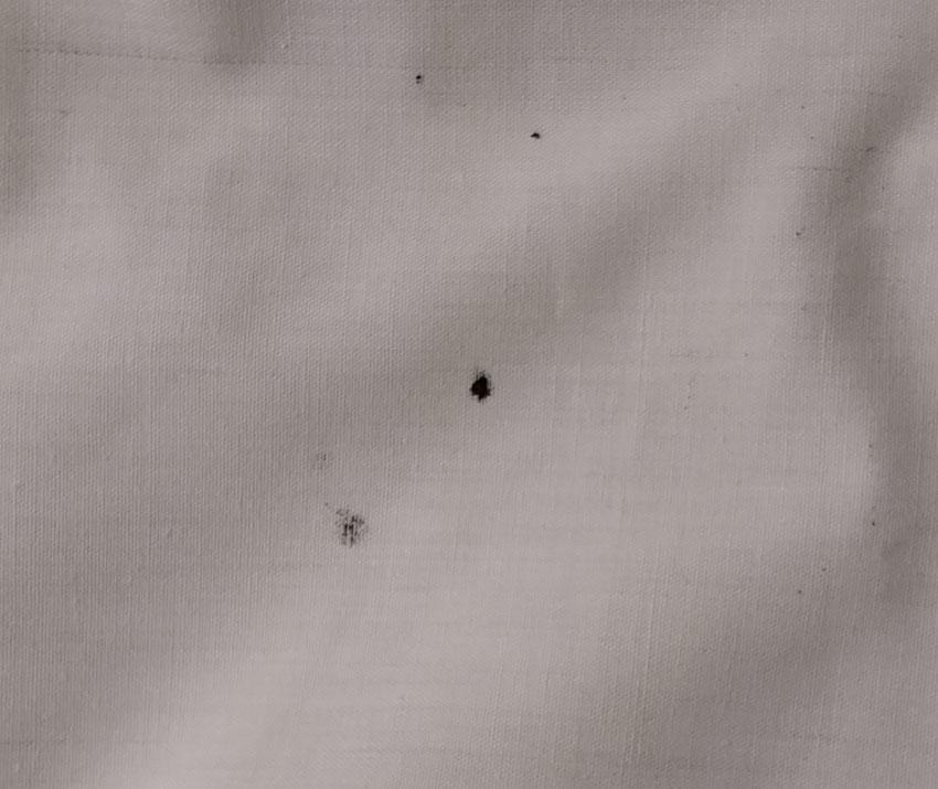 taille de la blouse medium pantalon large. 2 petites taches d'encre de la taille d'une tète d'épingle sur le pantalon à peine visibles. un sac pour les effets personnel également de l'hôpital