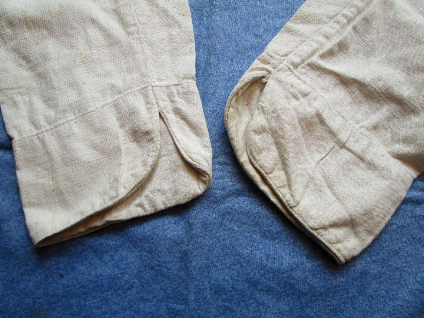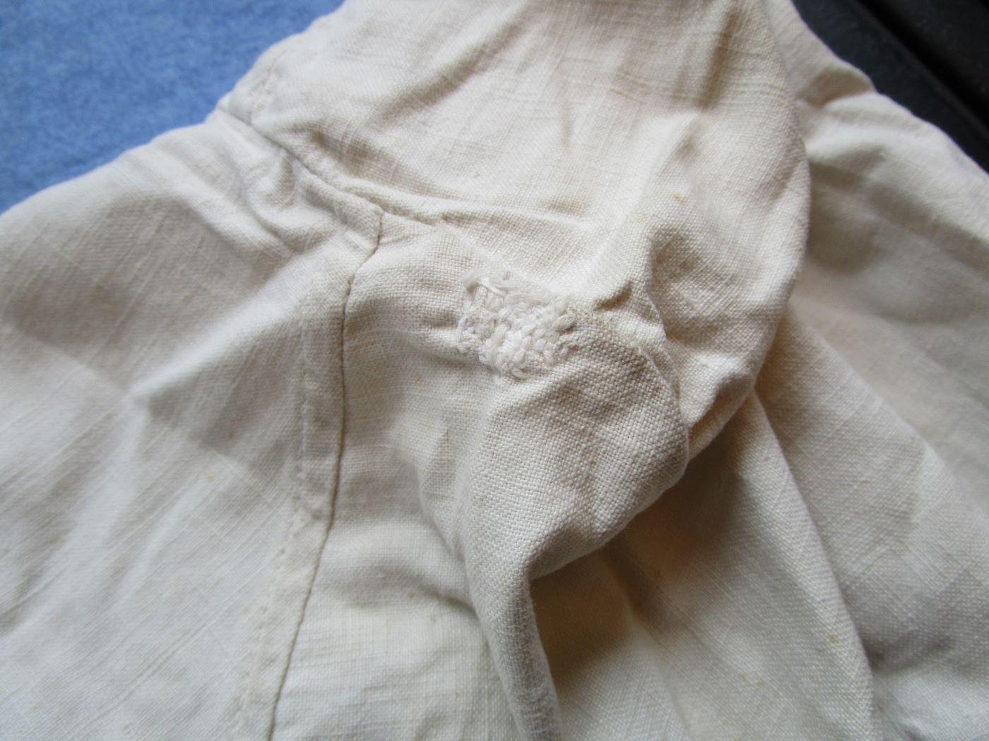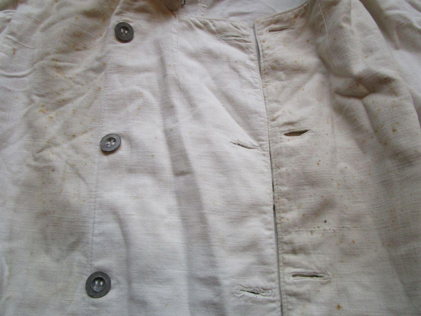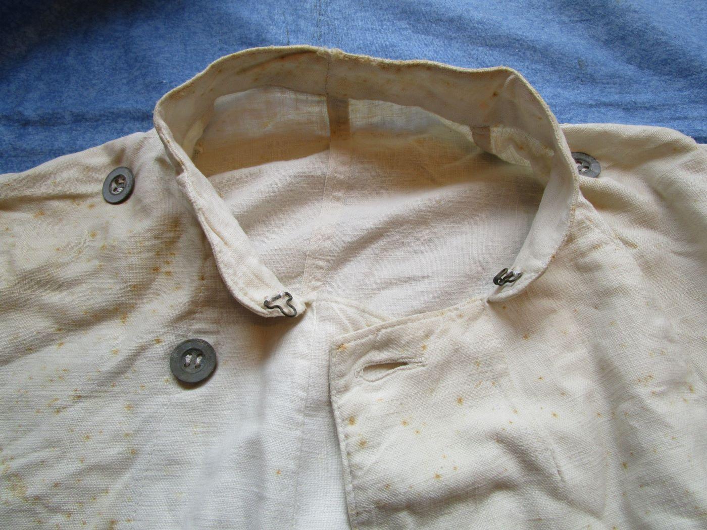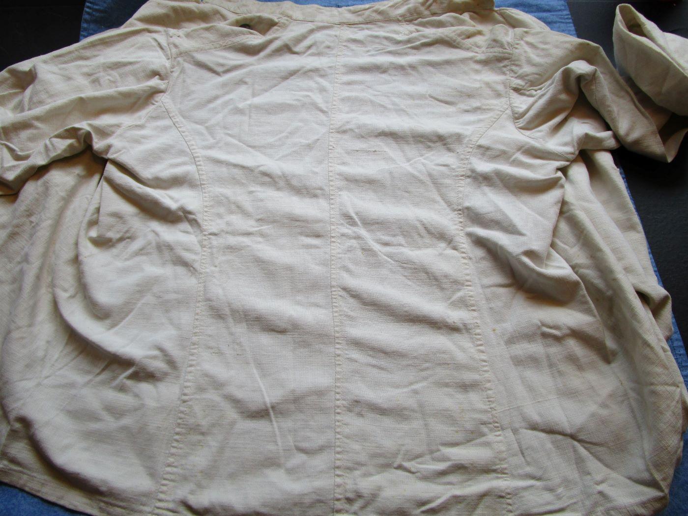 Veste croisée en coton blanc à double boutonnage (peut être troupes montées). Dos en deux parties. Deux reprises d'époque (sans gravité). Boutons cuvettes remontés à l'identique. Aucun marquage visible. Largeur d'épaule de 44 cm. Prévoir 8.80 euros en colissimo ou 4.90 euros par mondial relay. Autres photos sur demande.