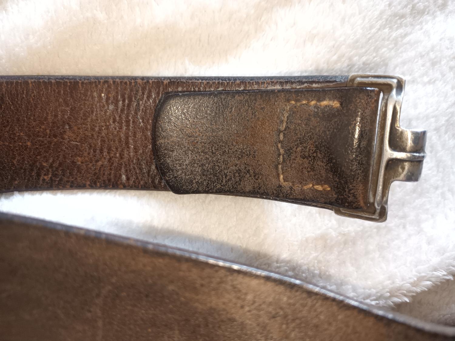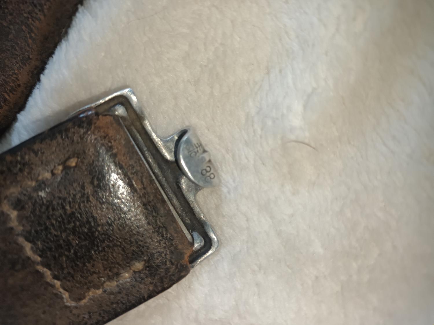Cuir souple avec boucle aluminium datée 38. Longueur 98 total. Avec couture luft sans fil plus court pour le double cuir . Pour un homme de 90cm de tour de hanche environ. Pièce terrain en TBE. Reste à cirer la partie noire. Livraison offerte par mondial relais payable avec PayPal de préférence entre proche.