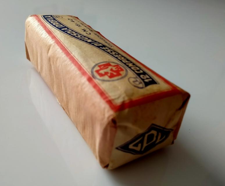 Boîte de 12 compresses médicales, de marque italienne. Utilisé par l’armée fasciste comme pour la Wehrmacht. Longueur totale de 11,5 cm. Marquages. Très bon état.
