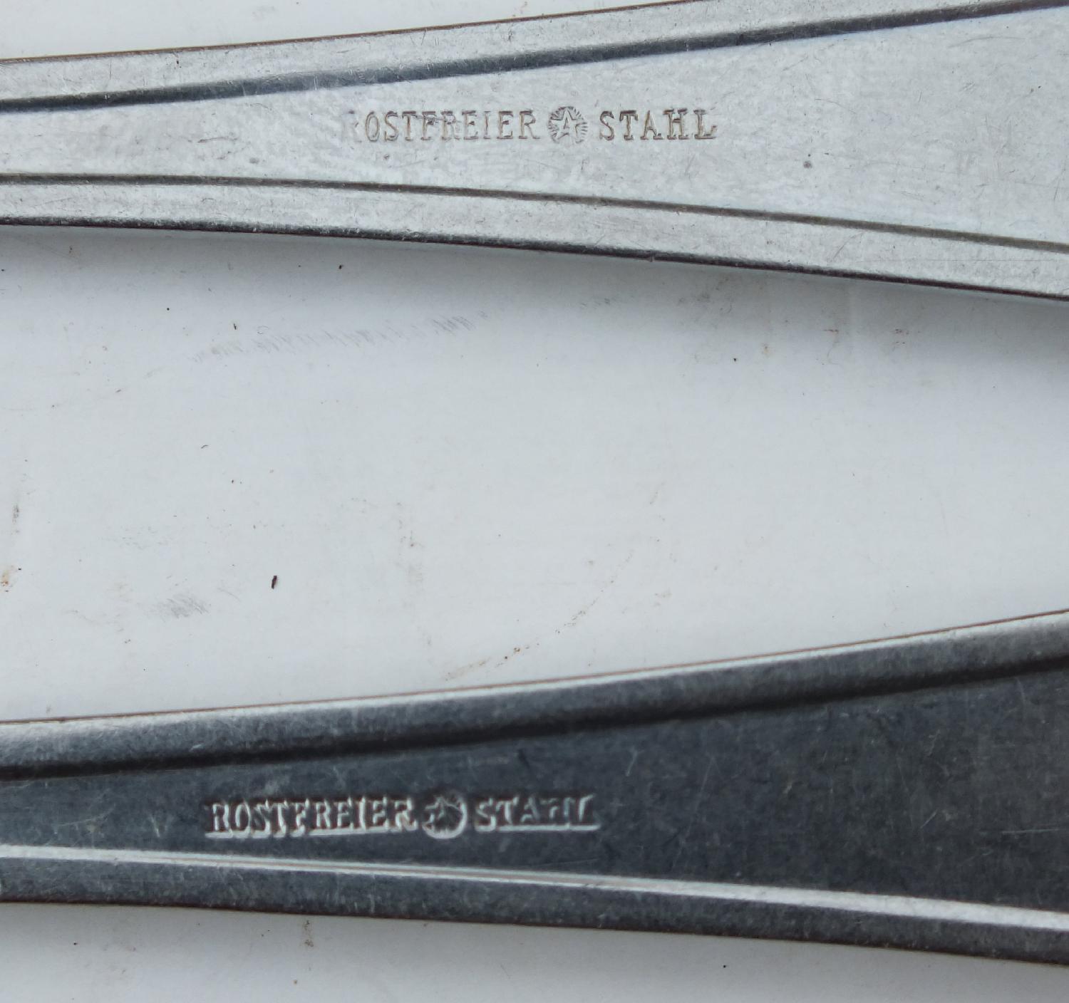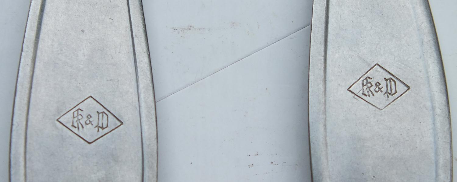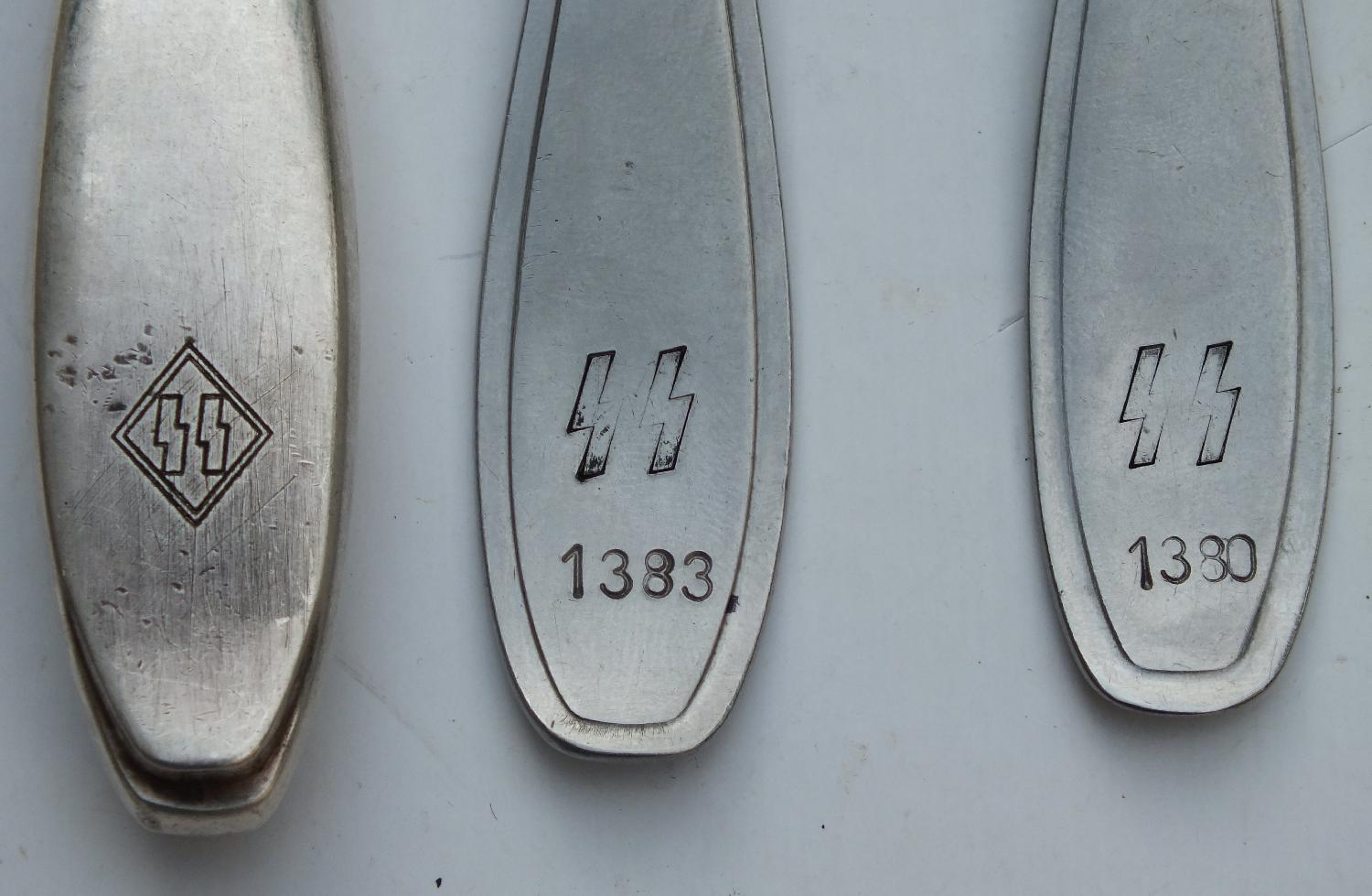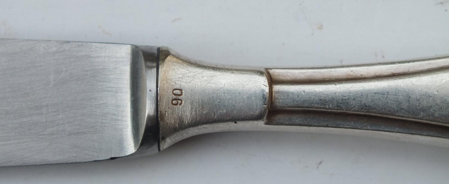 lot comprenant une fourchette et une cuillère ss de mess troupe avec marquages et un couteau de mess Officier avec marquages. Manche plaqué argent poinçonné du chiffre 90. La lame cassée a été remplacée.