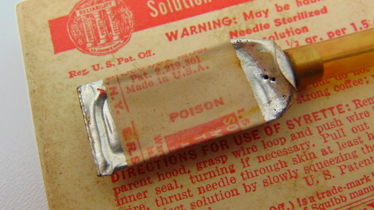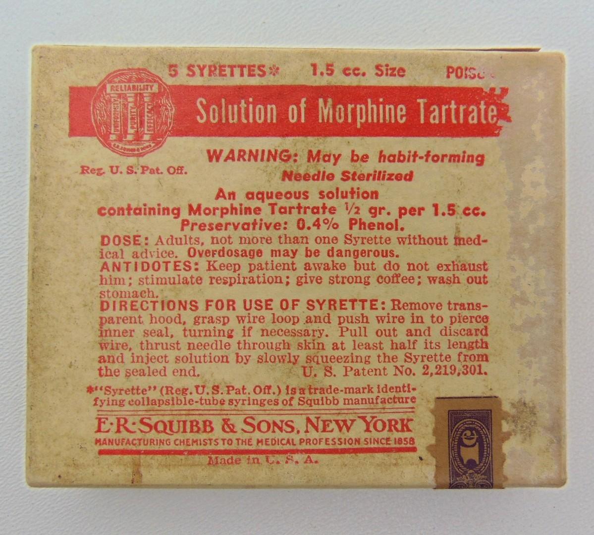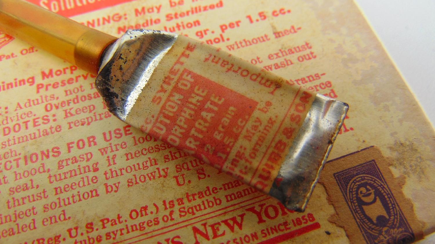 Rarissime boîte en carton, contenant cinq syrettes de morphine vidées de leur contenu