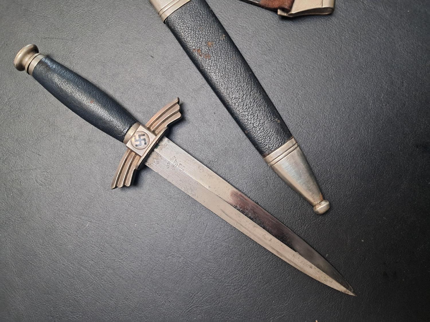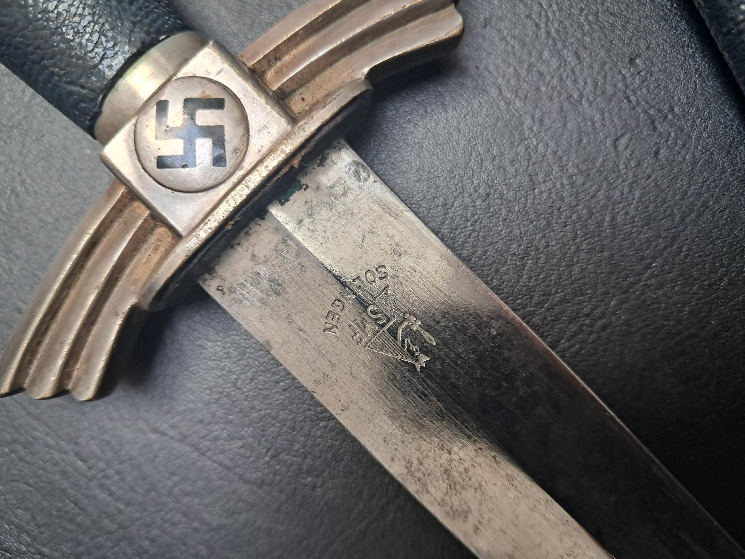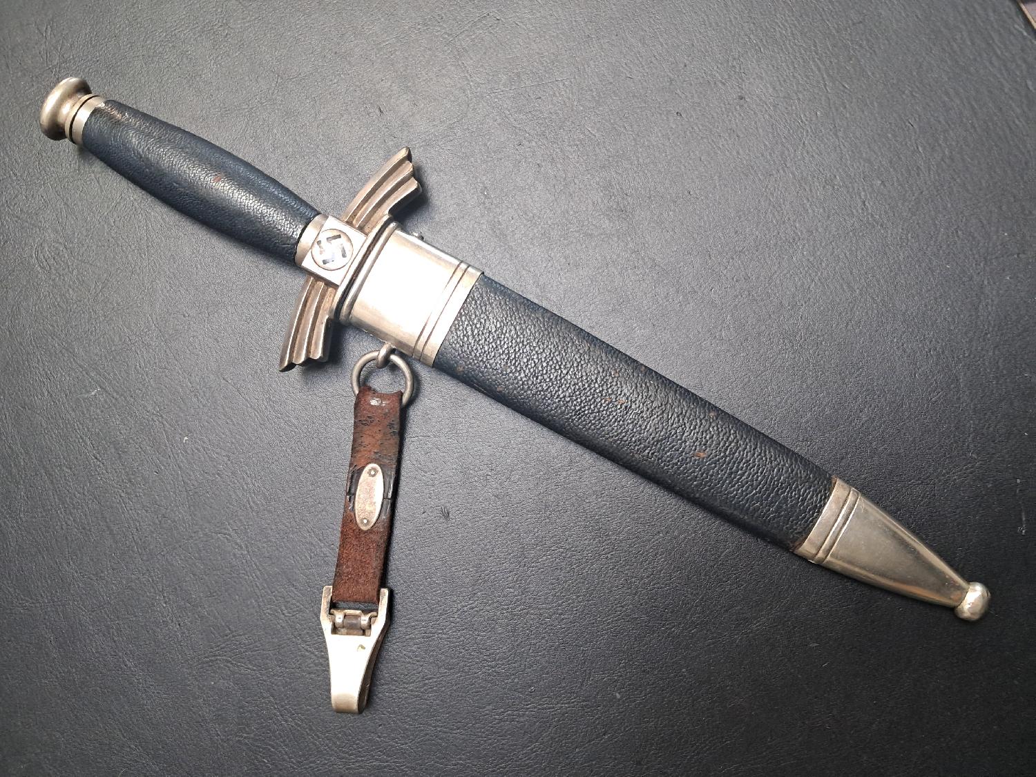 Fabricant SMF Solingen, la provenance de cette dague sera fournie à l'acheteur. Pièce d'origine à 100%, à déplorer le manque de trois vis, prix en conséquence.